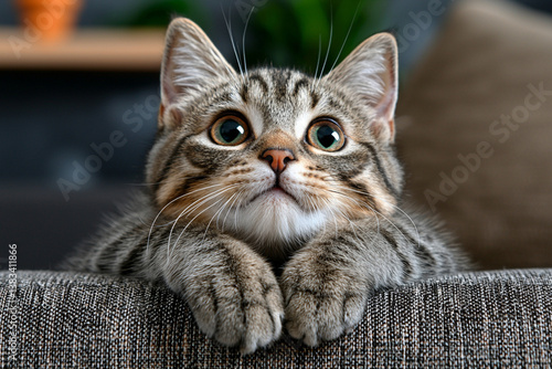 Cute playful gray kitten with big eyes resting on sofa, looking curious and attentive. This adorable pet brings joy and warmth to any home environment