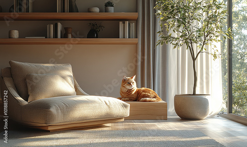 cute red cat on soft sofa, spacious living room interior, sofa, furniture in brown colors