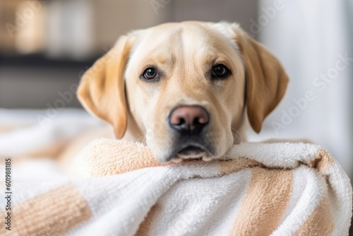 Cute relaxed dog lying on clean towels after taking bath . AI Generated