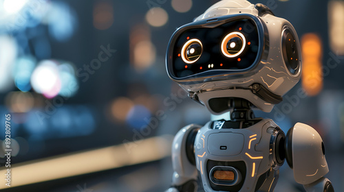 cute robot with large eyes and smiling mouth stands in front of the camera, looking at it. In blurred background there is an office building with lights on