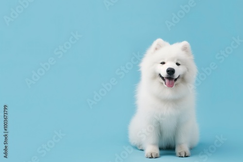 Cute Samoyed dog on white background with fluffy fur and happy expression. Fluffy white dog breed with blue eyes. Playful dog companion with cute face and soft fur.