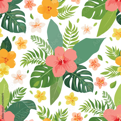 Cute Seamless Pattern with Flowers and Exotic Plant