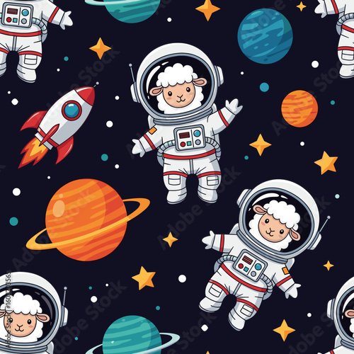 Cute sheep astronauts in space: Seamless pattern for kids' textile, wallpaper, or fabric.