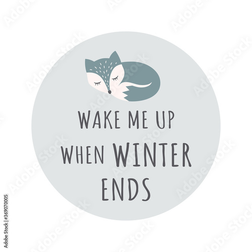 Cute sleeping fox colorful cartoon character. T-shirt design with Wake Me Up When Winter Ends lettering for kids or baby print.