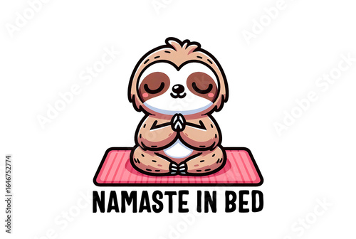 Cute sloth meditating in yoga pose isolated on transparent background with namaste in bed text