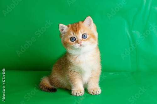 cute, small, kittens, British Golden breed, chinchilla, sits, green background