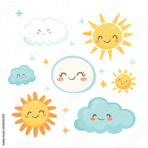 cute smiling suns and fluffy clouds for stiker