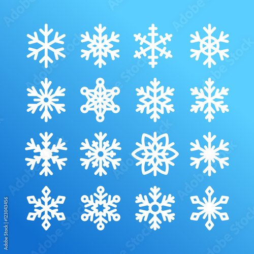 Cute snowflake collection isolated on blue background. Flat snow icons, snow flakes silhouette. Nice element for christmas banner, cards. New year ornament. Organic and geometric snowflakes set.
