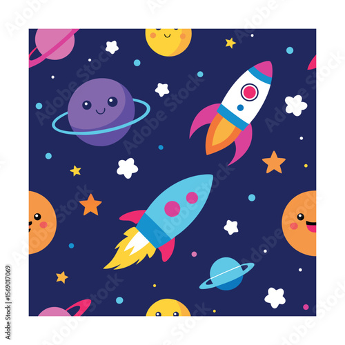 Cute Space Theme Seamless Pattern with Rockets and Stars