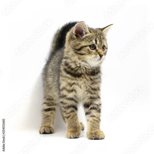 Cute tabby brown kitten standing isolated on white background. Newborn kitten, Kid animals and adorable cats concept