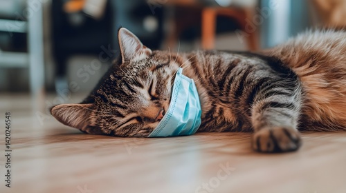 Cute Tabby Cat Sleeping on Floor with Face Mask