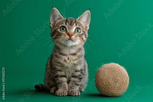 Cute tabby kitten sitting and observing a ball of yarn on green background