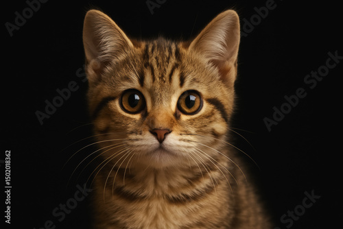 Cute tabby kitten staring at camera on black background, high detail portrait, generative AI