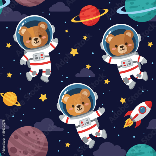 Cute teddy bear astronauts floating in space - seamless pattern for kids' products.