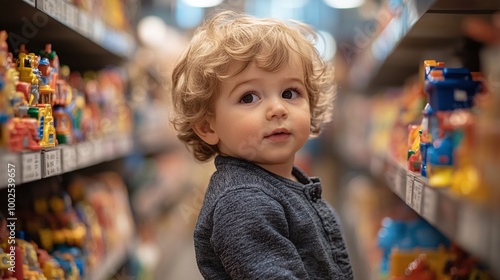 cute toddler boy exploring a toy store, showcasing the thrill of discovery and the joy of play in a colorful, family-friendly environment filled with exciting toys and possibilities
