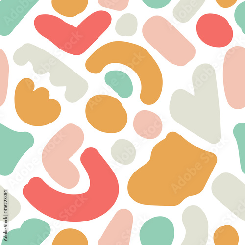 Cute trendy motley seamless pattern with abstract nature elements shape blots on white background, vector illustration in simple flat style