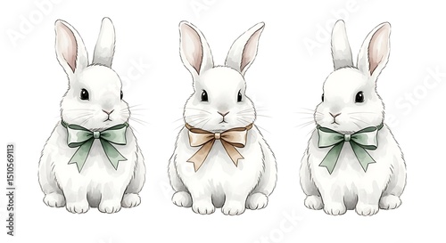 Cute watercolor illustration of three rabbits with bows, featuring soft pastel tones and fine brush details, isolated on white