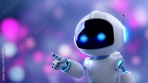 Cute white humanoid robot pointing forward with glowing blue eyes on a blurred tech background.