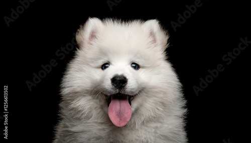 cute white samoyed puppy lick screen showing tongue isolated on black background front view
