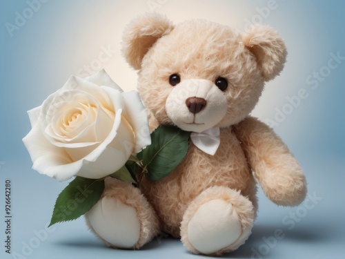 Cute white teddy bear holding a white rose on blue background. Romantic gift, love concept