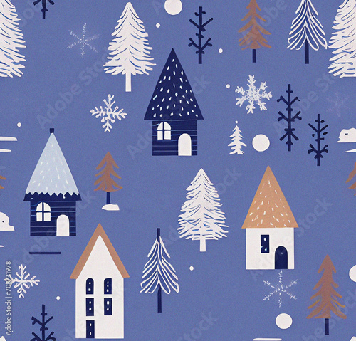 Cute winter landscape with houses and trees. Beautiful background. Flyer, card design