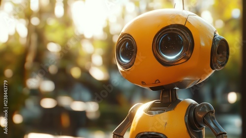 Cute yellow robot outdoors, bokeh background, tech future