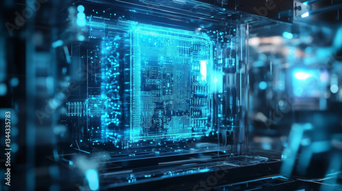 cutting edge AI supercomputer with intricate circuitry is displayed futuristic environment, showcasing glowing blue elements and advanced technology. scene evokes sense of innovation and