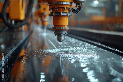 Cutting machinery operates in an industrial setting with water jets and precision tools in a factory environment