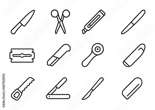 Cutting Tools Icons. Outline icon set of cutting instruments: knife, scissors, paper cutter, letter opener,