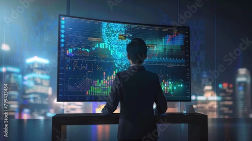CuttingEdge AI Analysis Expert Engaged with Realtime Data on Vertical Monitor