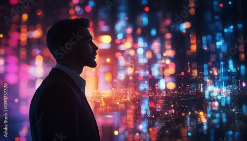 Cuttingedge real estate visionary interacting with holographic homes, advanced smart tech, and a futuristic city backdrop illuminated with vibrant lights