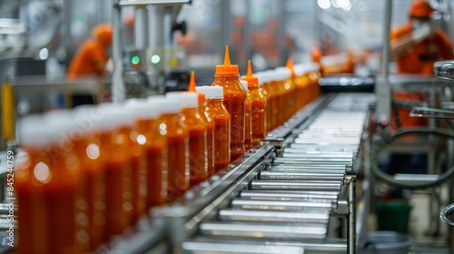 Cutting-edge robotics on a Sriracha sauce production line, modern and clean factory setting, ensuring safety and quality, Asian cuisine integration