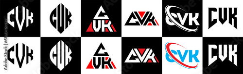 CVK letter logo design in six style. CVK polygon, circle, triangle, hexagon, flat and simple style with black and white color variation letter logo set in one artboard. CVK minimalist and classic logo