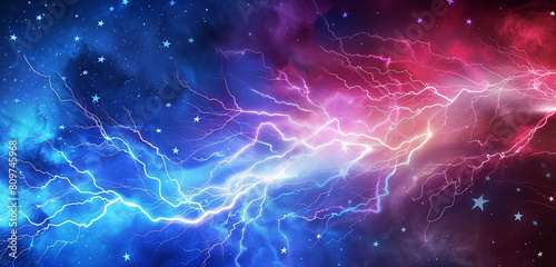 Cyan and magenta lightning explosion over a fluid patriotic scene, bright.