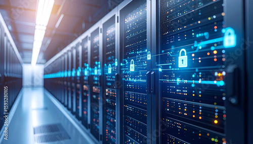 Cyber Fortress: A cutting-edge data center safeguards critical information, illuminated by a network of glowing security symbols, representing the powerful protection offered by advanced technology.