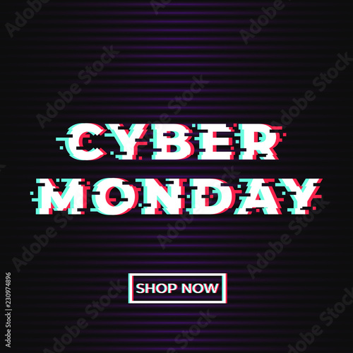 Cyber monday sale promotion web banner with glitch effect. Interference text and shop now button on dark background. Concept for online shop. Vector illustration