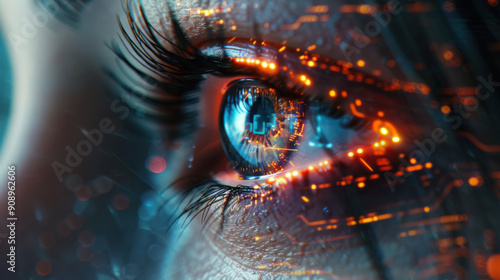 cyber security, An intense close-up of a female eye integrated with a dynamic hologram security display. The environment features sleek tech elements and glowing sensors, as the