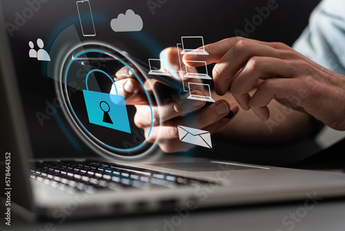 Cyber security and futuristic technology concept businessman using finger to touch fingerprint interface,to scan password,with technology icons and padlock,with artificial intelligence system or ai.