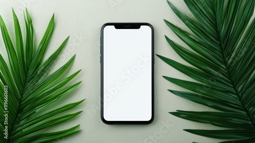 Cyber security and sleek, A smartphone with a blank screen, surrounded by green palm leaves on a neutral background.