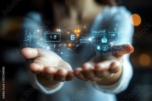 Cyber Security. Businessman holding digital cybersecurity icons, data