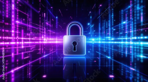 Cyber security concept. Padlock symbol in neon glowing digital background. Perfect for websites, presentations, and marketing materials related to data protection, privacy, and technology