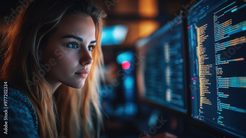 Cyber Security Expert, A female IT specialist analyzes AI threats to consumer data privacy while coding and ethical hacking in a dark office environment