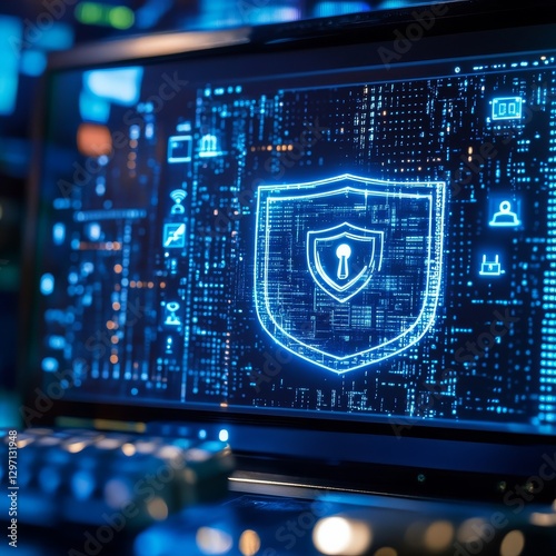 Cyber Security Interface: Shield icon and digital network with glowing blue lights, displayed on computer screen.