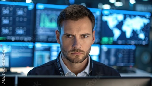 cyber security ransomware prevention concept. Focused man monitoring data on multiple screens in a high-tech environment.
