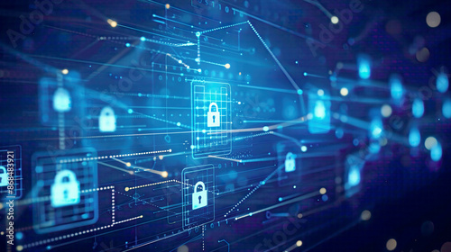 Cyber security technology digital lock icons with network connections blue background highlighting data protection and online security
