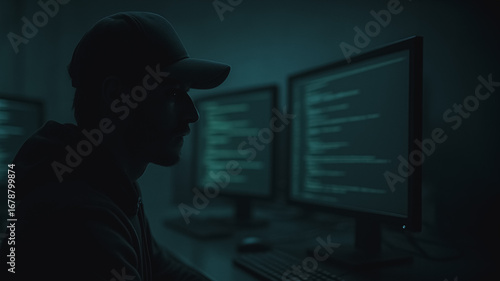 Cyber Shadow: A shadowy figure intently focuses on a computer screen, immersed in lines of code, hinting at the mysterious world of cybersecurity and digital complexity.