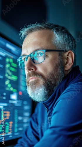 Cyber Vigilance Unleashed Mature Tech Professionals Immersive Blue-Toned Digital Security Monitoring Experience - Next-Gen Cybersecurity Intelligence