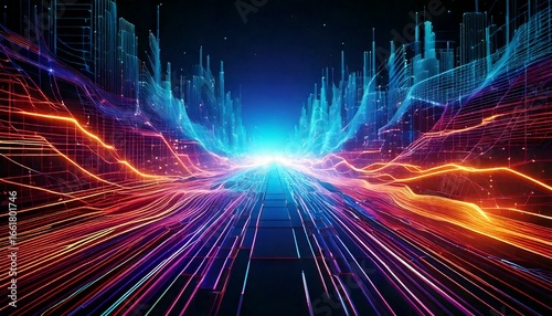 Cyber-inspired abstract scene with radiant 3D shapes and electrified wire patterns