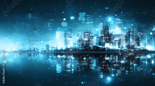 Cybernetic Cityscape Digital Metropolis Futuristic Skyline with Data Stream Reflections on Water