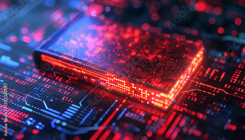 Cybernetic Core: Red-Blue Glowing Microchip on Circuit Board